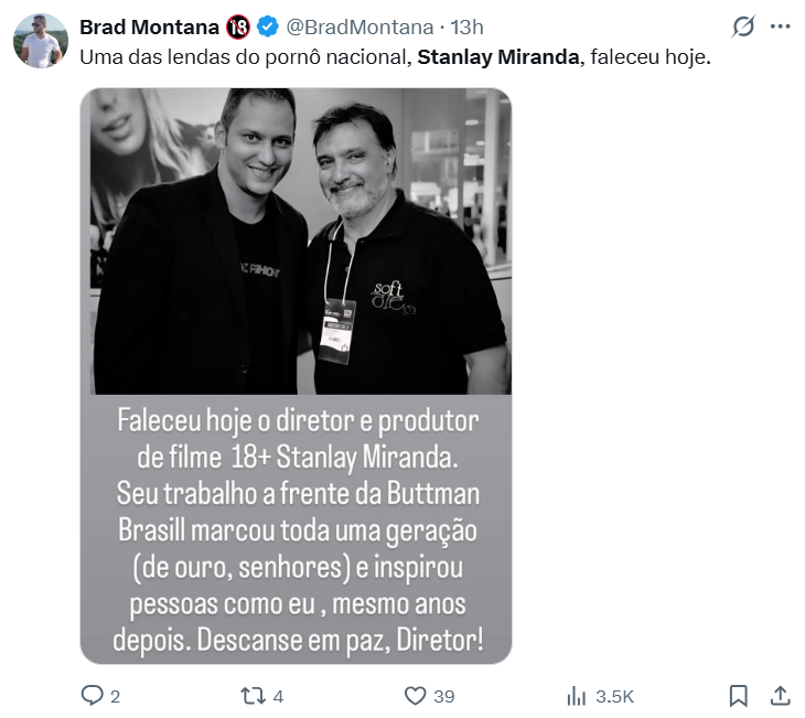 Lenda do pornô nacional Brad Montana se despede de Stanlay Miranda em publicação no X: